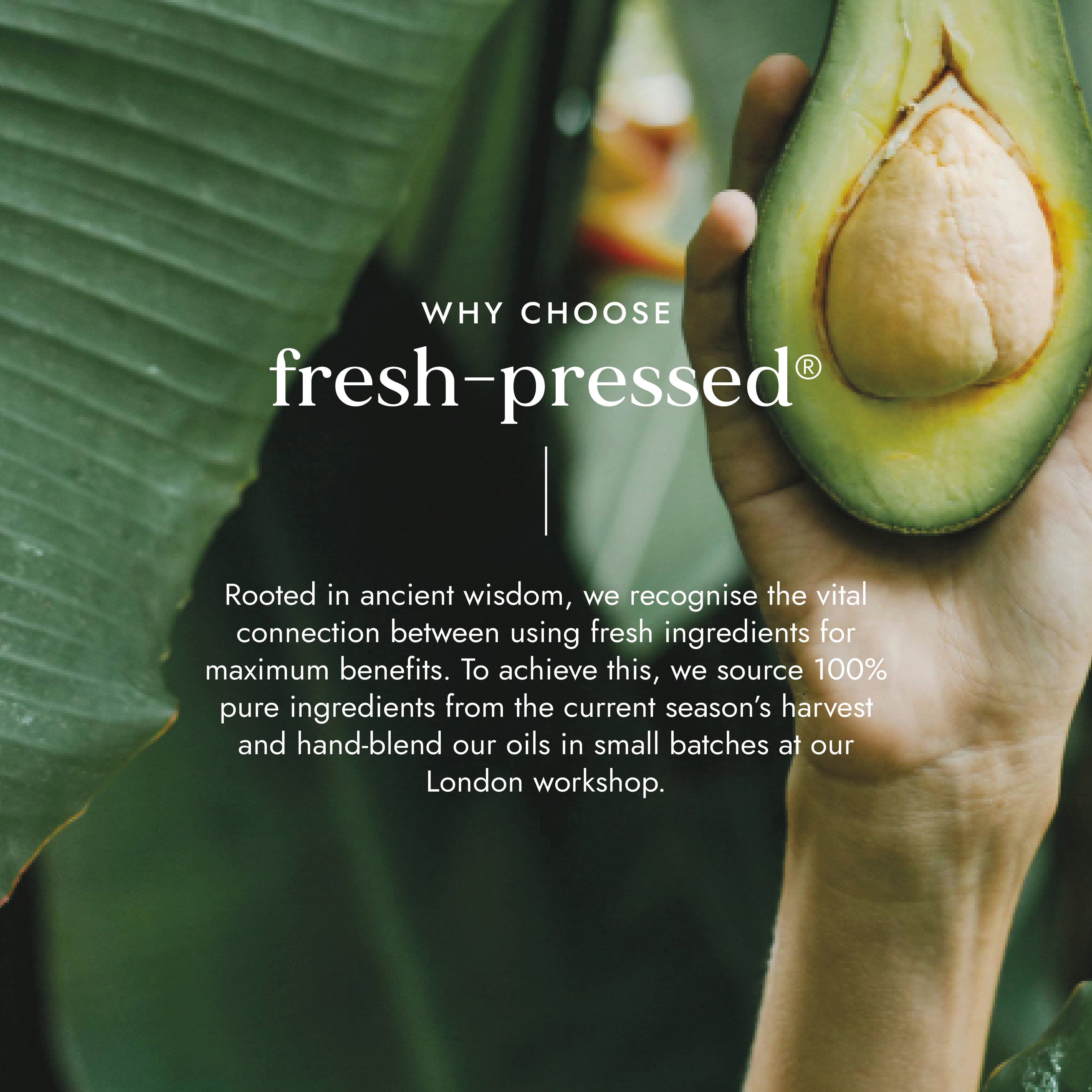 We hand-blend pure Fushi Fresh-Pressed® oils, in our London workshop, using traditional ayurvedic methods to create our Really Good Hair Oil. To ensure potency and efficacy, the organic herbs and oils are infused for 3 months, before being freshly bottled.