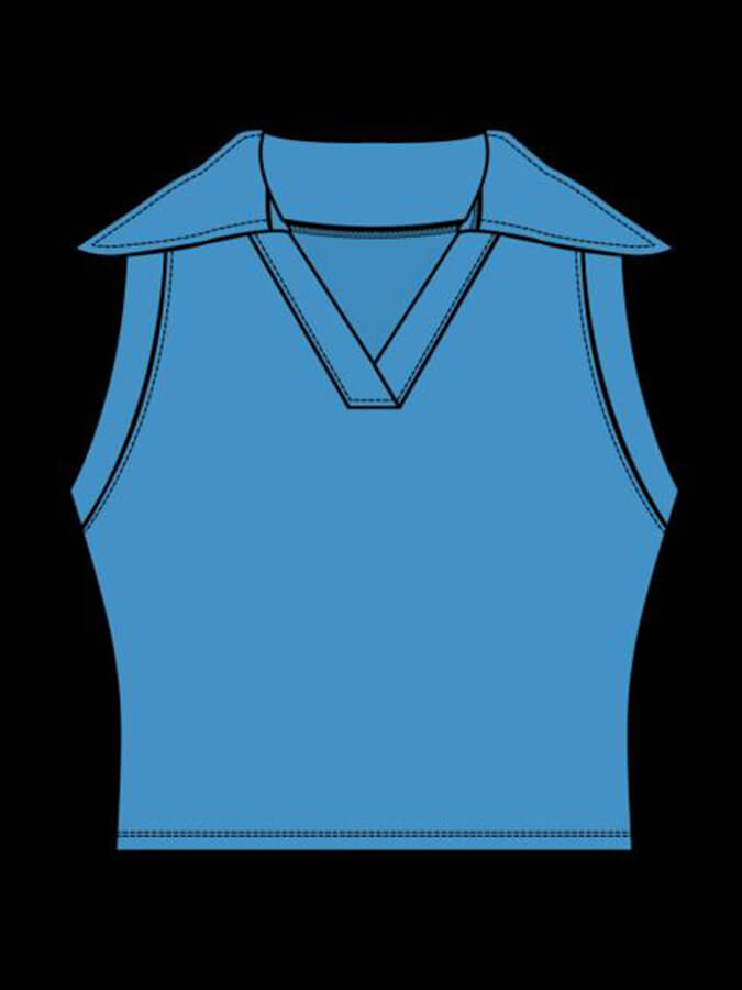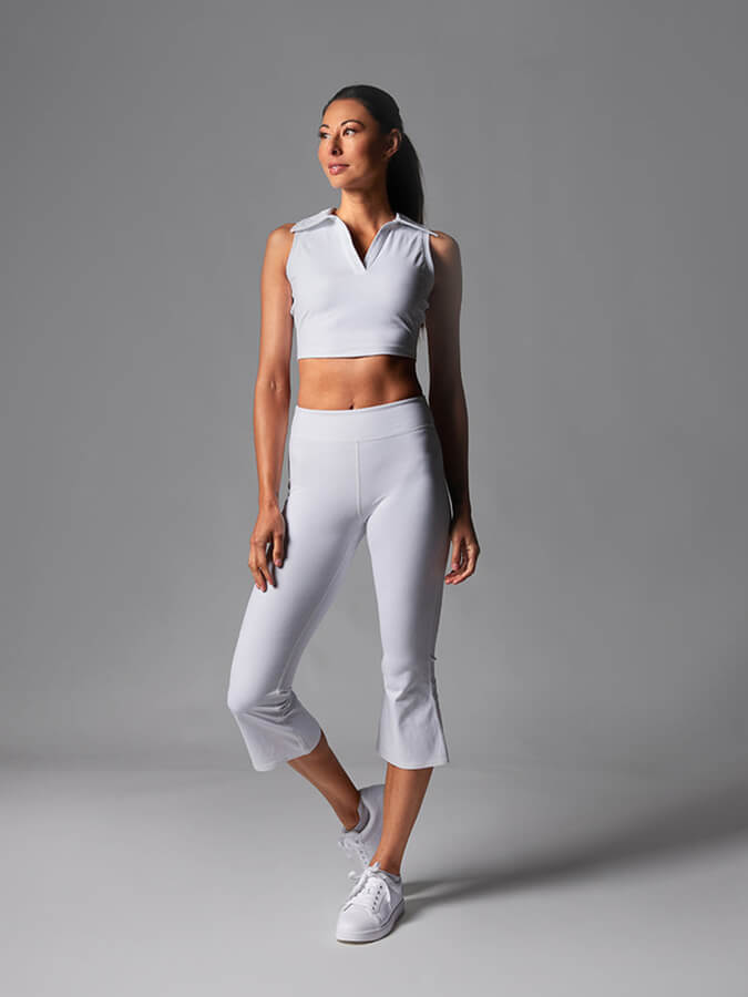 FIT: Sleeveless V-neck polo style fitted tank with collar. Bottom band panel. Length hits at natural waist. Designed for low-impact movement.